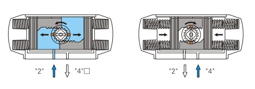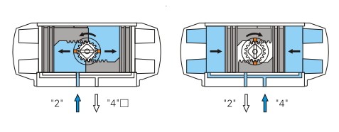 當氣源壓力從氣口(2)進入氣缸兩活塞之間中腔時,使兩活塞分離向氣缸兩端方向移動,兩端氣腔的空氣通過氣口(4)排除, 同時使兩活塞齒條同步帶動輸出軸(齒輪)逆時針方向旋轉(zhuǎn)。反之氣源壓力從氣口(4)進入氣缸兩端氣腔時,使兩活塞向 氣缸中間方向移動,中間氣腔的空氣通過氣口(2)排除,同時使兩活塞齒條同步帶動輸出軸(齒輪)順時針方向旋轉(zhuǎn)。 (如果把活塞相對反方向安裝,輸出軸變?yōu)榉聪蛐D(zhuǎn),即為雙作用反轉(zhuǎn)型)